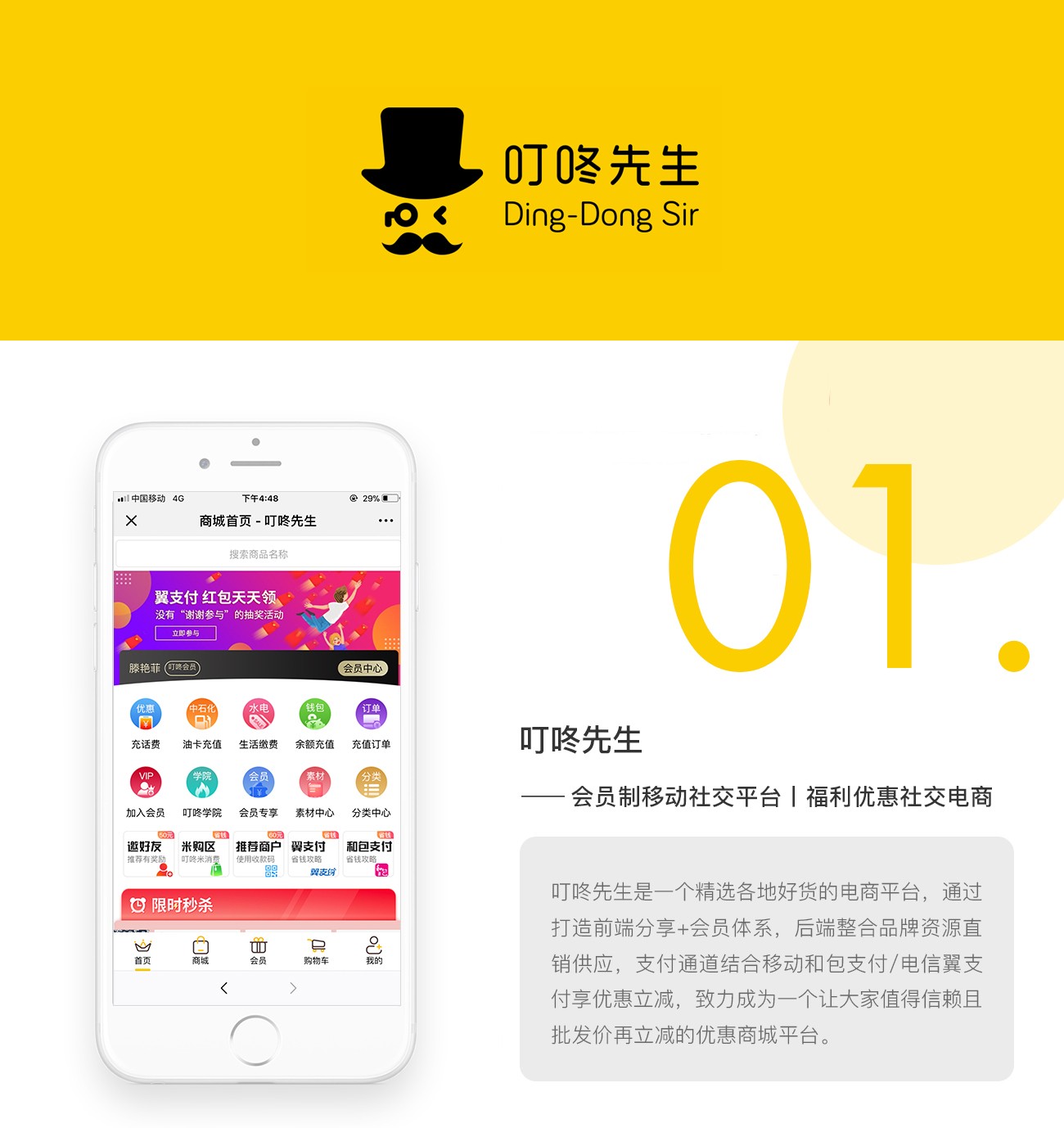 叮咚先生电商平台集生活常规用品的销售与分销,通过翼支付和和包支付来实现优惠买单