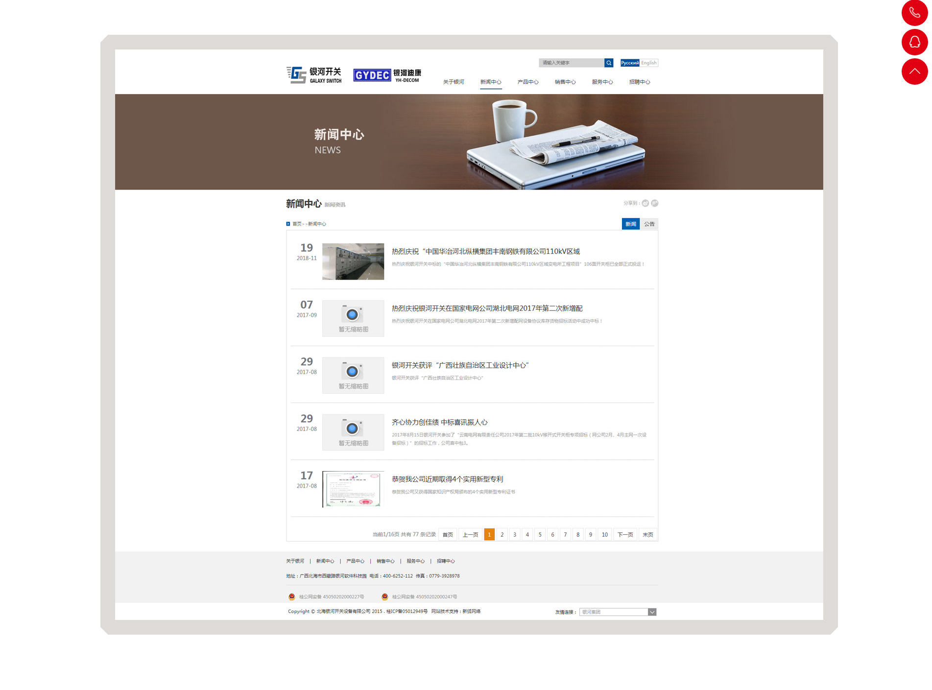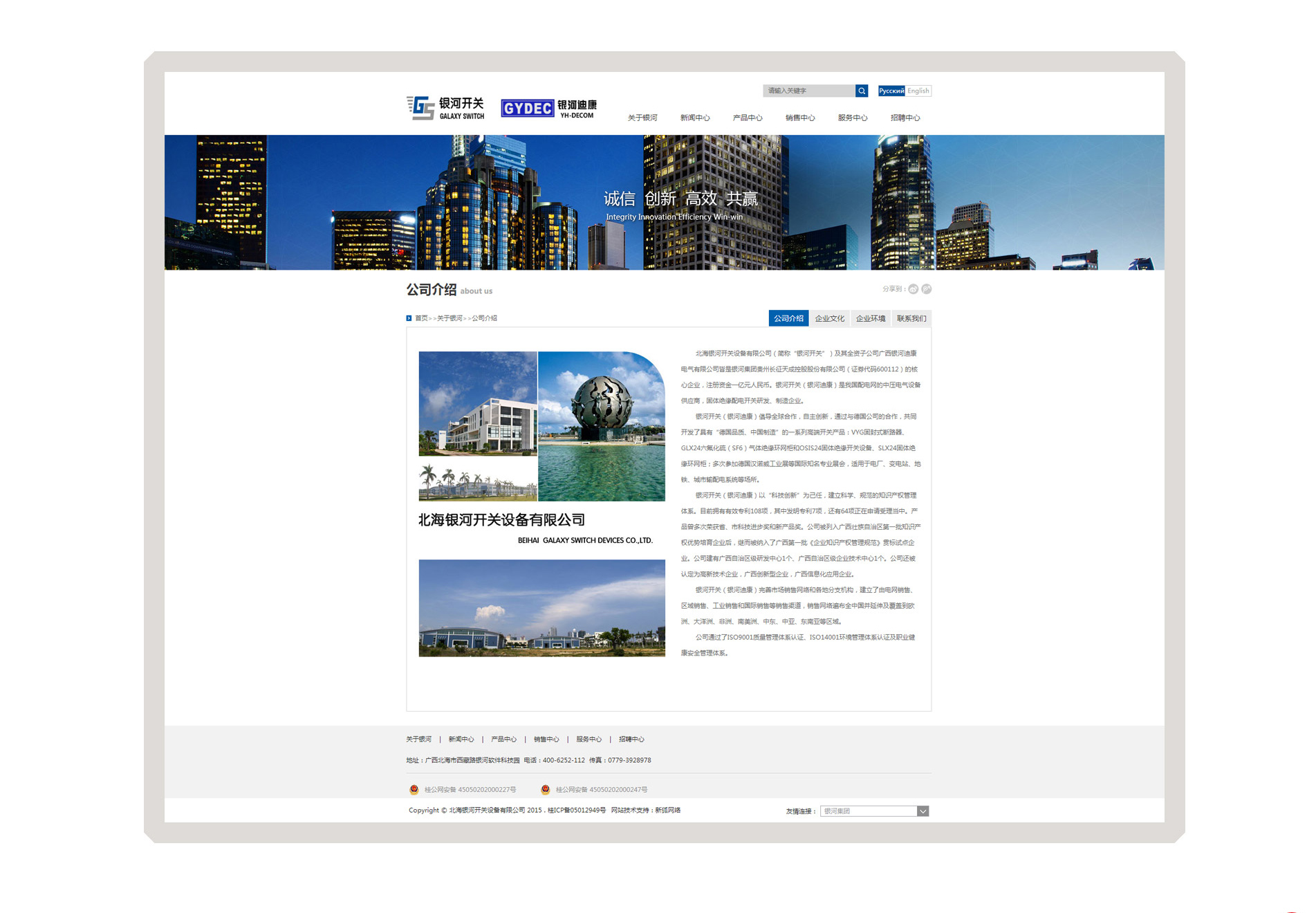 北海银河开关设备有限公司(简称“银河开关”)及其全资子公司广西银河迪康电气有限公司皆是银河集团贵州长征天成控股股份有限公司(证券代码600112) 的核心企业,注册资金一亿元人民币。银河开关是我国坚强智能电网的中压电气设备供应商,广西最大的固体绝缘配电开关研发、制造企业。